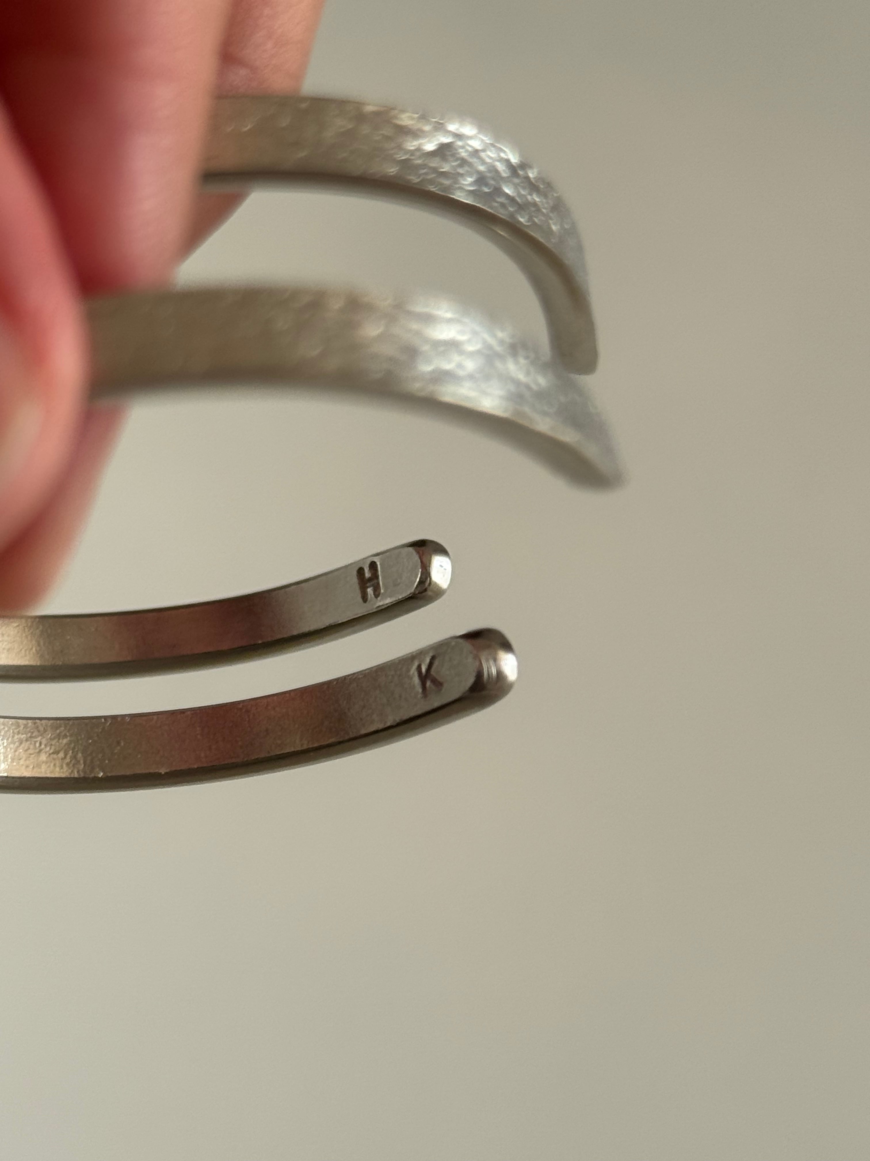バングルの内側に1文字のアルファベット刻印加工ができます。ご希望のアルファベットをメッセージにてお伝えください